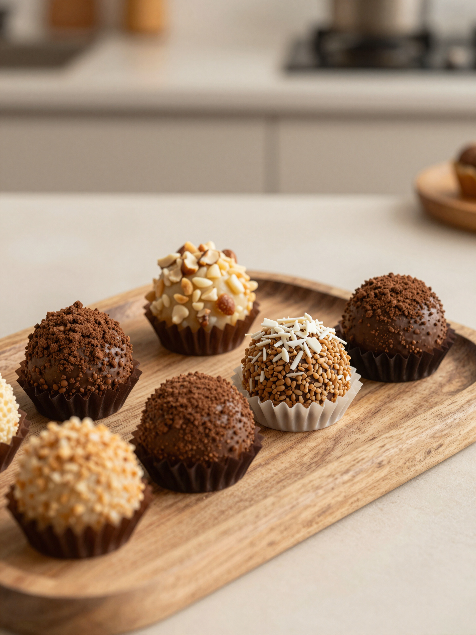 Nossos clássicos boleados à mão com chocolate belga e confeitos artesanais.